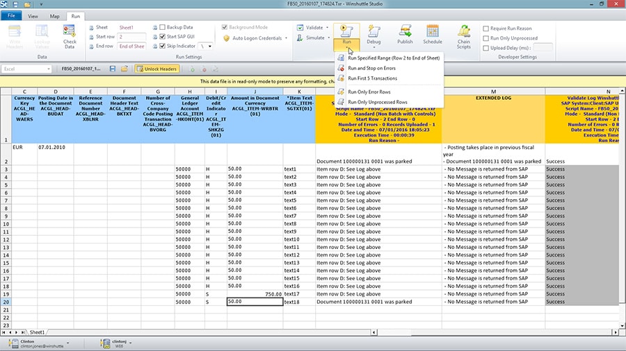 O Runner permite que você melhore a eficiência identificando facilmente erros, para que você possa corrigir e reprocessar rapidamente seus dados. O suplemento do Winshuttle Studio para o Excel oferece flexibilidade, não exigindo que você tenha um conhecimento detalhado do seu sistema SAP subjacente ou os detalhes técnicos de como funciona a transação ou consulta da SAP. Insira, mantenha e extraia dados SAP sem ter que usar diretamente as telas SAP GUI.